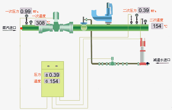 减压装置是将高压蒸汽节流减压至用户所需压力的实现部分,由平衡式电动减压阀,压力传感器、多功能控制器及节流装置组成压力传感器安装在蒸汽管道的下游,实时监测减压后的蒸汽压力,PI(比例积分)模式调节阀门的开度。无论上游压力如何变化,下游负荷如何变化,下游蒸汽压力都保持稳定。
